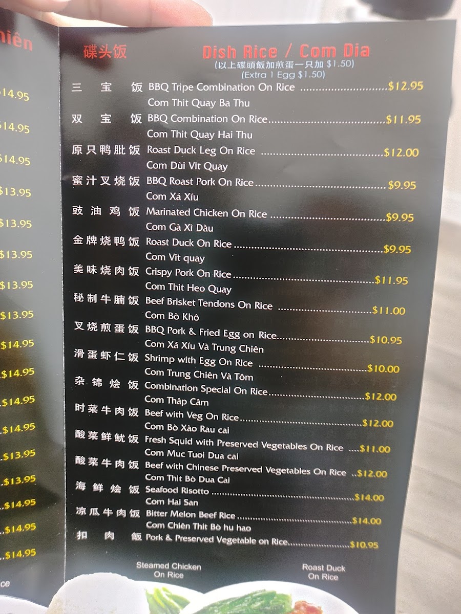 Roasted duck, marinated chicken, roasted pork, or crispy pork.