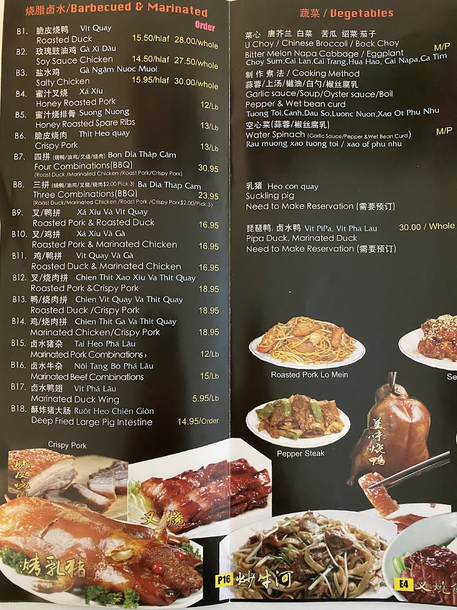 Roast duck, marinated chicken, roast pork, and crispy pork.